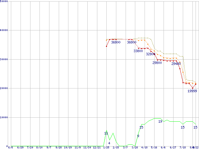 | Core 2 Duo E8500 (3.16GHz,L2 6MB)の価格推移 | | | (2007年6月8日~2008年8月22日) |