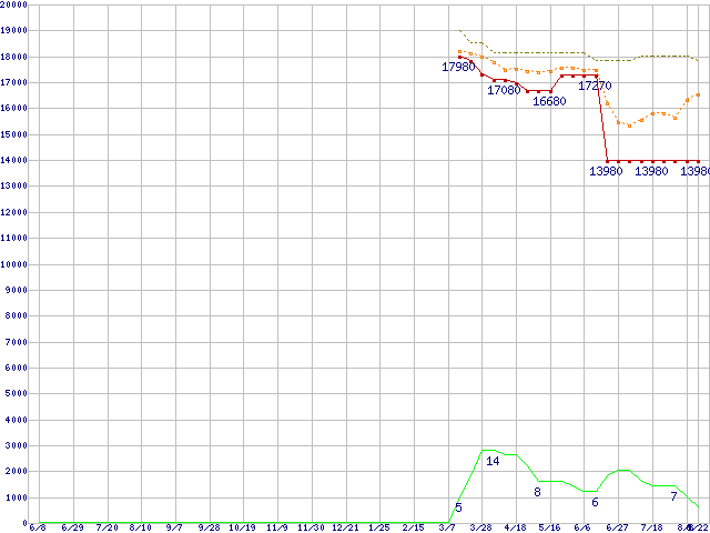 ※このグラフは過去のデータも税率5%相当に調整した税込み相当額のグラフです。 税率変更や、総額表示方式導入(2004年4月)の影響は除いています。 | | | ●凡例 | 最安値 (点線部は販売店未確認 または未調査) | 平均値 | 最高値 | ショップ数 |