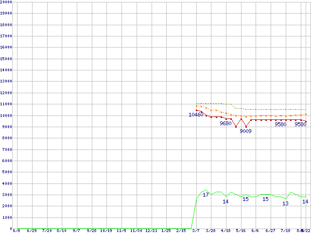※このグラフは過去のデータも税率5%相当に調整した税込み相当額のグラフです。 税率変更や、総額表示方式導入(2004年4月)の影響は除いています。 | | | ●凡例 | 最安値 (点線部は販売店未確認 または未調査) | 平均値 | 最高値 | ショップ数 |