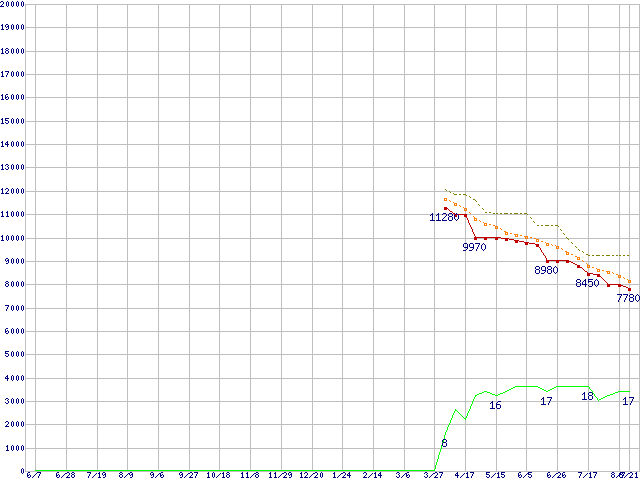 ※このグラフは過去のデータも税率5%相当に調整した税込み相当額のグラフです。 税率変更や、総額表示方式導入(2004年4月)の影響は除いています。 | | | ●凡例 | 最安値 (点線部は販売店未確認 または未調査) | 平均値 | 最高値 | ショップ数 |