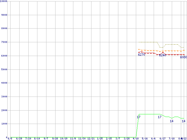 ※このグラフは過去のデータも税率5%相当に調整した税込み相当額のグラフです。 税率変更や、総額表示方式導入(2004年4月)の影響は除いています。 | | | ●凡例 | 最安値 (点線部は販売店未確認 または未調査) | 平均値 | 最高値 | ショップ数 |