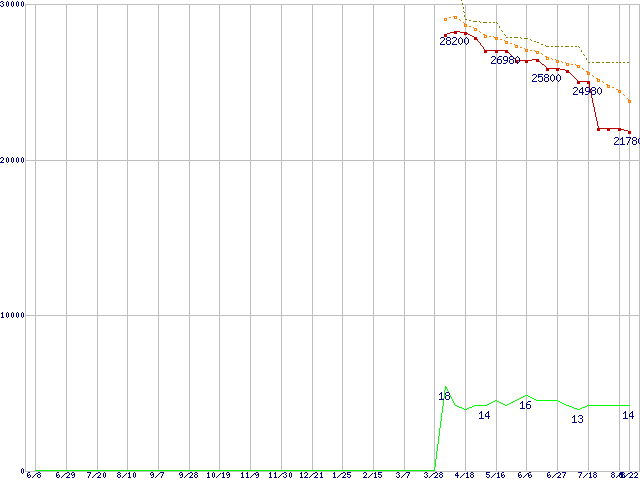 ※このグラフは過去のデータも税率5%相当に調整した税込み相当額のグラフです。 税率変更や、総額表示方式導入(2004年4月)の影響は除いています。 | | | ●凡例 | 最安値 (点線部は販売店未確認 または未調査) | 平均値 | 最高値 | ショップ数 |