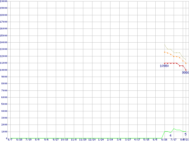 ※このグラフは過去のデータも税率5%相当に調整した税込み相当額のグラフです。 税率変更や、総額表示方式導入(2004年4月)の影響は除いています。 | | | ●凡例 | 最安値 (点線部は販売店未確認 または未調査) | 平均値 | 最高値 | ショップ数 |
