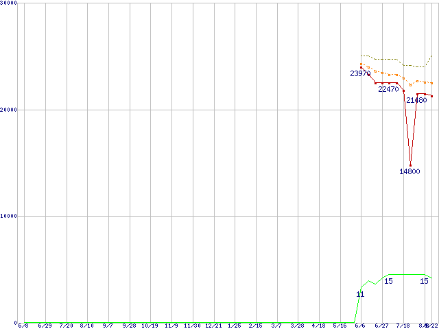 | Phenom X4 9750 (2.4GHz,L2 512KB×4,L3 2MB,TDP 95W)の価格推移 | | | (2007年6月8日~2008年8月22日) |