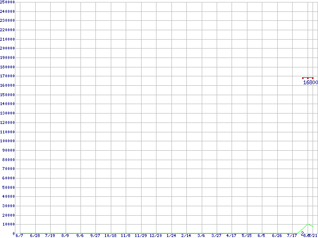 ※このグラフは過去のデータも税率5%相当に調整した税込み相当額のグラフです。 税率変更や、総額表示方式導入(2004年4月)の影響は除いています。 | | | ●凡例 | 最安値 (点線部は販売店未確認 または未調査) | 平均値 | 最高値 | ショップ数 |