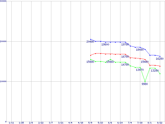| Socket AM2 (HyperTransport 3.0,Triple Core,TDP 95W)の最安値推移 | | | (2008年1月11日~2008年8月22日) |