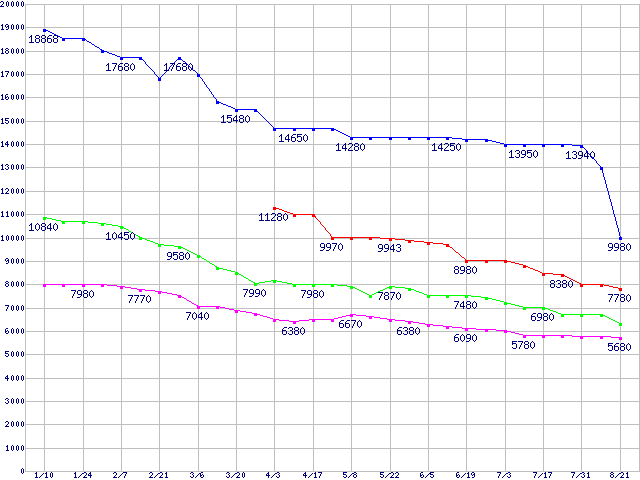 WD Caviar Blue (7200rpm,3Gb/s,16MB)の最安値推移