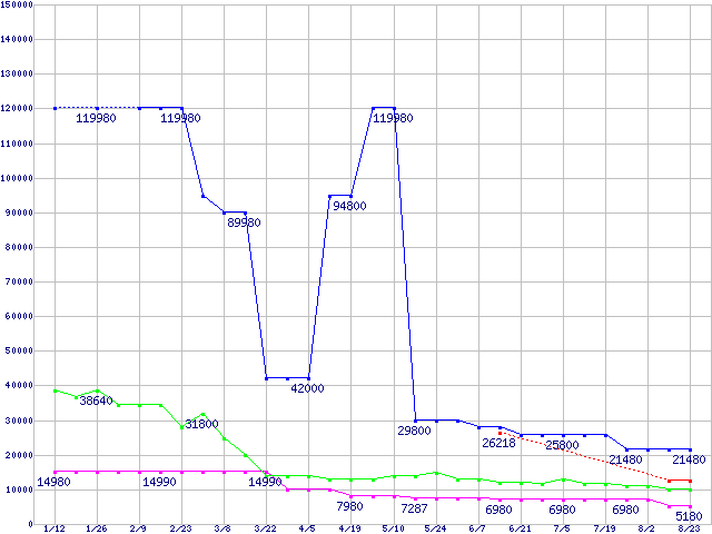 PC3-12800(DDR3-1600) DDR3 SDRAM DIMMの最安値推移