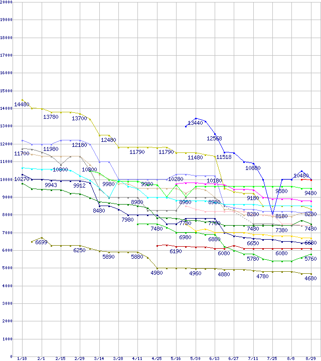 | CPU主要製品(最安値1万円未満)の最安値推移 | | | (2008年1月18日~2008年8月29日) |