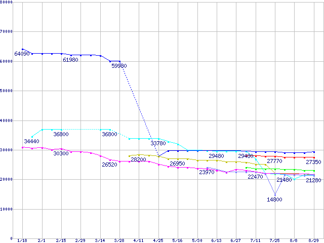 | CPU主要製品(最安値2万円~3万円未満)の最安値推移 | | | (2008年1月18日~2008年8月29日) |