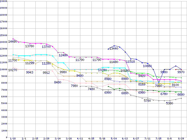 | AMD系CPUの最安値推移 | | | (2008年1月18日~2008年8月29日) |