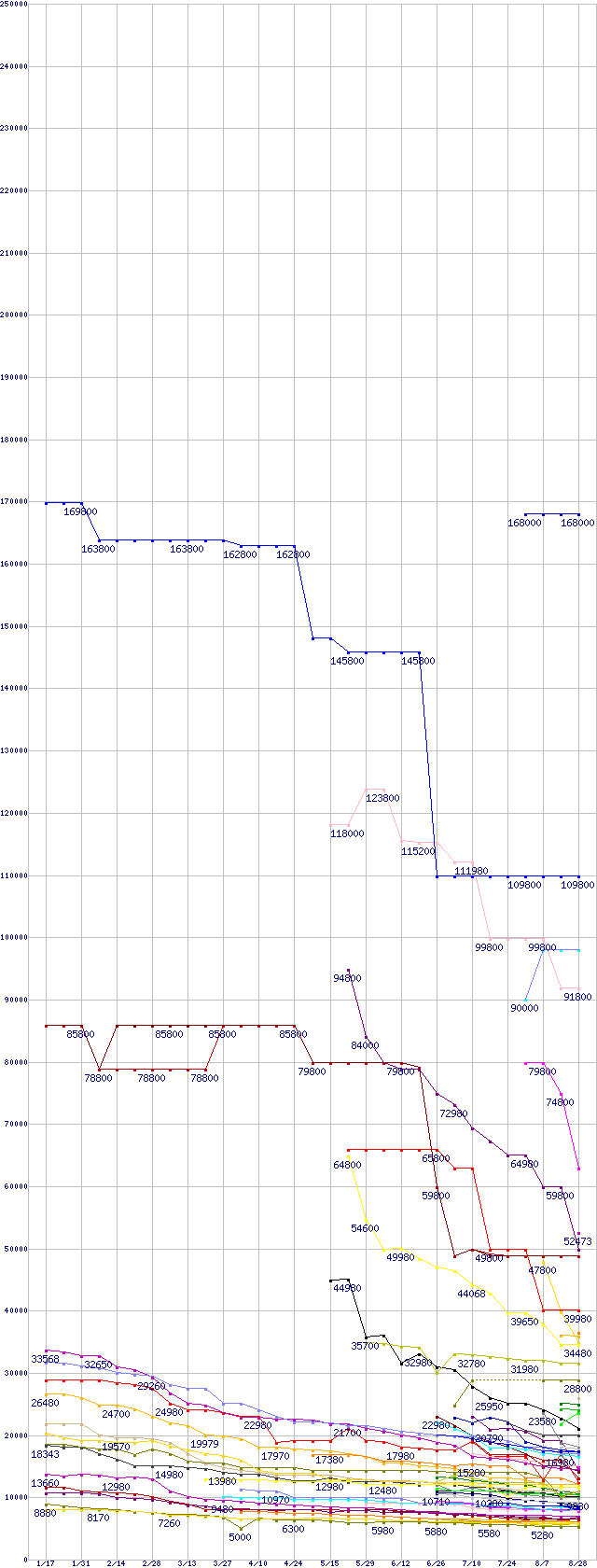 | HDD/SSD主要製品の最安値推移 | | | (2008年1月17日~2008年8月28日) |