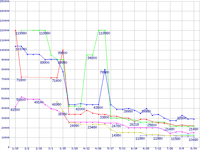 メモリ主要製品(最安値5千円~1万円未満)の最安値推移