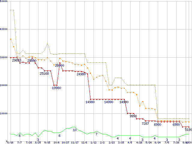 ※このグラフは過去のデータも税率5%相当に調整した税込み相当額のグラフです。 税率変更や、総額表示方式導入(2004年4月)の影響は除いています。 | | | ●凡例 | 最安値 (点線部は販売店未確認 または未調査) | 平均値 | 最高値 | ショップ数 |