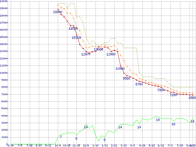 ※このグラフは過去のデータも税率5%相当に調整した税込み相当額のグラフです。 税率変更や、総額表示方式導入(2004年4月)の影響は除いています。 | | | ●凡例 | 最安値 (点線部は販売店未確認 または未調査) | 平均値 | 最高値 | ショップ数 |