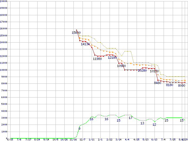 | Athlon X2 5200 (2.7GHz,L2 512KB×2)の価格推移 | | | (2007年6月15日~2008年8月29日) |