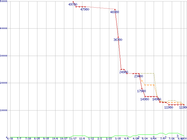※このグラフは過去のデータも税率5%相当に調整した税込み相当額のグラフです。 税率変更や、総額表示方式導入(2004年4月)の影響は除いています。 | | | ●凡例 | 最安値 (点線部は販売店未確認 または未調査) | 平均値 | 最高値 | ショップ数 |
