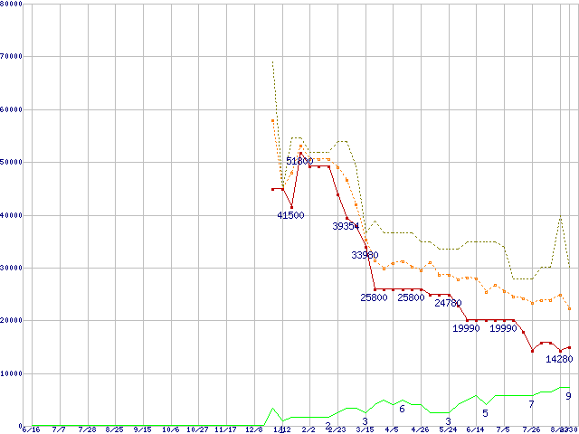 ※このグラフは過去のデータも税率5%相当に調整した税込み相当額のグラフです。 税率変更や、総額表示方式導入(2004年4月)の影響は除いています。 | | | ●凡例 | 最安値 (点線部は販売店未確認 または未調査) | 平均値 | 最高値 | ショップ数 |
