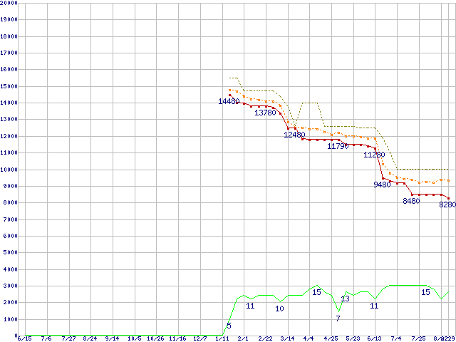 | Athlon X2 5400 (2.8GHz,L2 512KB×2)の価格推移 | | | (2007年6月15日~2008年8月29日) |