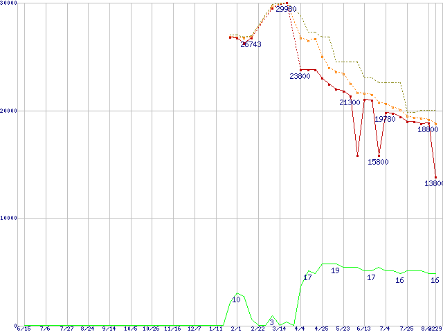| Core 2 Duo E8400 (3GHz,L2 6MB)の価格推移 | | | (2007年6月15日~2008年8月29日) |