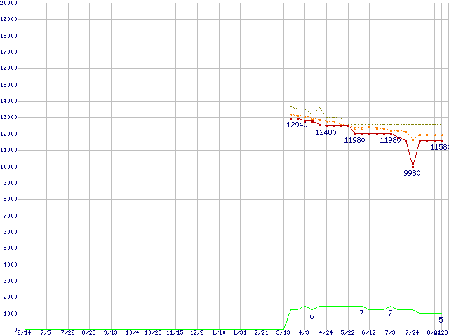 ※このグラフは過去のデータも税率5%相当に調整した税込み相当額のグラフです。 税率変更や、総額表示方式導入(2004年4月)の影響は除いています。 | | | ●凡例 | 最安値 (点線部は販売店未確認 または未調査) | 平均値 | 最高値 | ショップ数 |