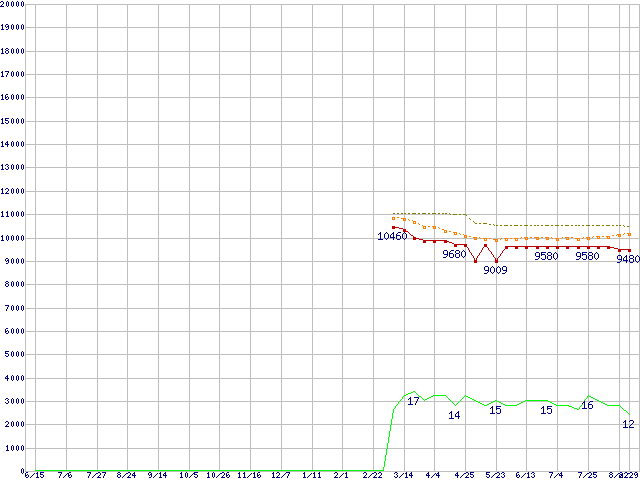 ※このグラフは過去のデータも税率5%相当に調整した税込み相当額のグラフです。 税率変更や、総額表示方式導入(2004年4月)の影響は除いています。 | | | ●凡例 | 最安値 (点線部は販売店未確認 または未調査) | 平均値 | 最高値 | ショップ数 |