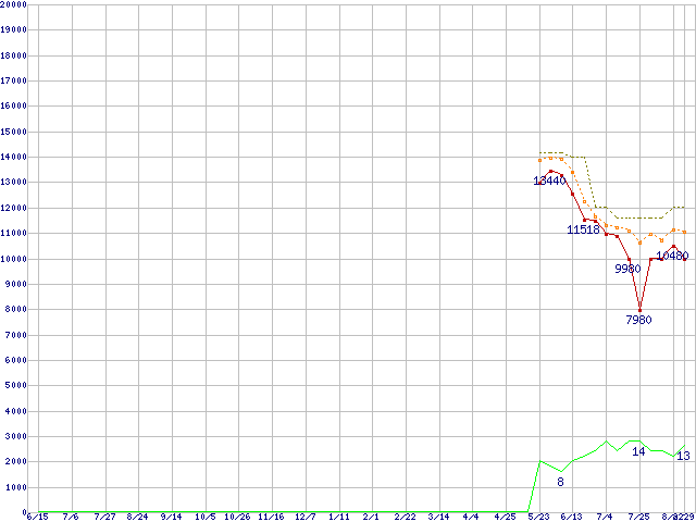 | Athlon X2 5600 (2.9GHz,L2 512KB×2)の価格推移 | | | (2007年6月15日~2008年8月29日) |