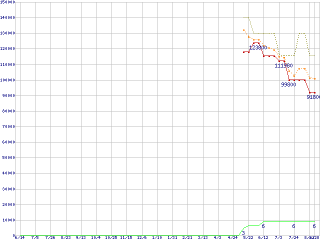※このグラフは過去のデータも税率5%相当に調整した税込み相当額のグラフです。 税率変更や、総額表示方式導入(2004年4月)の影響は除いています。 | | | ●凡例 | 最安値 (点線部は販売店未確認 または未調査) | 平均値 | 最高値 | ショップ数 |