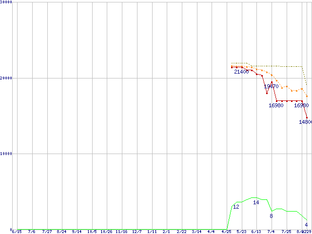 | Phenom X4 9100e (1.8GHz,L2 512KB×4,L3 2MB)の価格推移 | | | (2007年6月15日~2008年8月29日) |