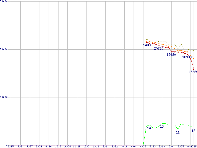 | Phenom X4 9550 (2.2GHz,L2 512KB×4,L3 2MB)の価格推移 | | | (2007年6月15日~2008年8月29日) |