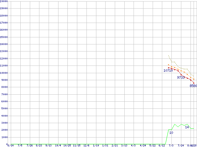 ※このグラフは過去のデータも税率5%相当に調整した税込み相当額のグラフです。 税率変更や、総額表示方式導入(2004年4月)の影響は除いています。 | | | ●凡例 | 最安値 (点線部は販売店未確認 または未調査) | 平均値 | 最高値 | ショップ数 |