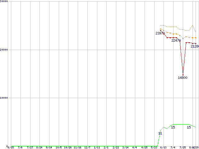 | Phenom X4 9750 (2.4GHz,L2 512KB×4,L3 2MB,TDP 95W)の価格推移 | | | (2007年6月15日~2008年8月29日) |