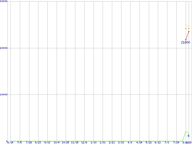 ※このグラフは過去のデータも税率5%相当に調整した税込み相当額のグラフです。 税率変更や、総額表示方式導入(2004年4月)の影響は除いています。 | | | ●凡例 | 最安値 (点線部は販売店未確認 または未調査) | 平均値 | 最高値 | ショップ数 |