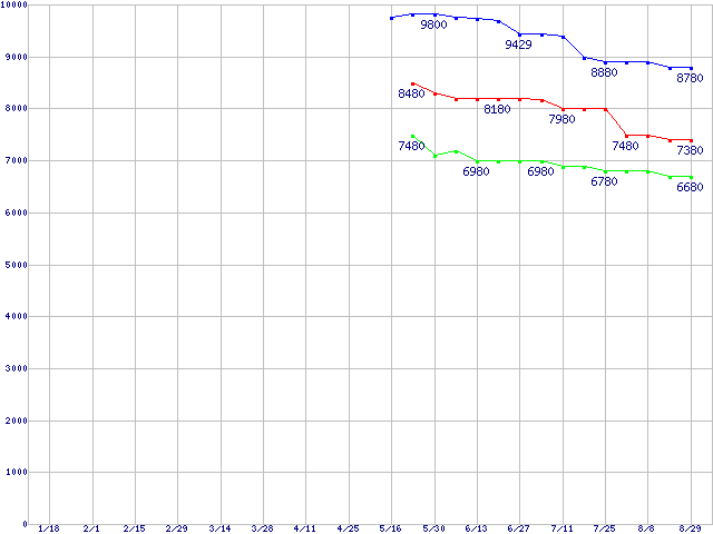 | Socket AM2 (HyperTransport,Dual Core,TDP 45W)の最安値推移 | | | (2008年1月18日~2008年8月29日) |