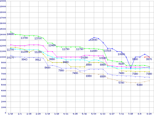 | Socket AM2 (HyperTransport,Dual Core,TDP 65W)の最安値推移 | | | (2008年1月18日~2008年8月29日) |
