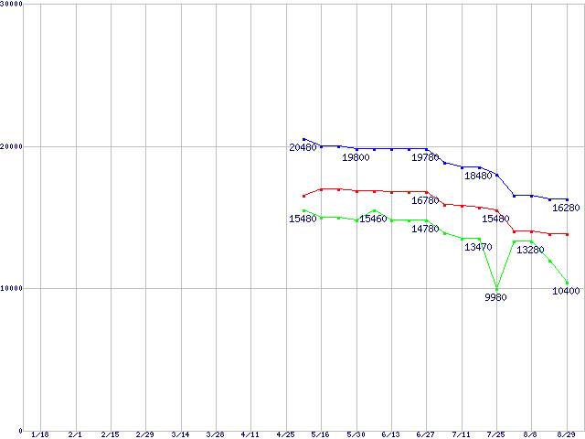 | Socket AM2 (HyperTransport 3.0,Triple Core,TDP 95W)の最安値推移 | | | (2008年1月18日~2008年8月29日) |