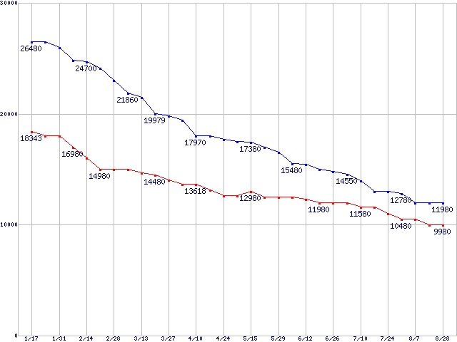 WD Caviar Blue (7200rpm,3Gb/s,16MB)の最安値推移