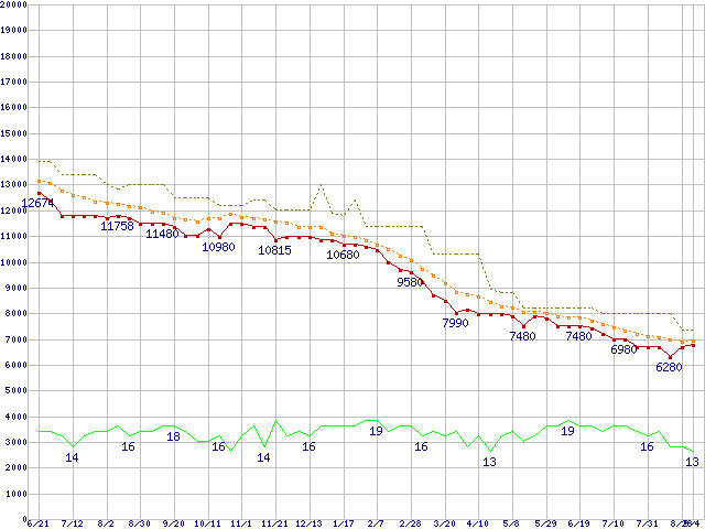 ※このグラフは過去のデータも税率5%相当に調整した税込み相当額のグラフです。 税率変更や、総額表示方式導入(2004年4月)の影響は除いています。 | | | ●凡例 | 最安値 (点線部は販売店未確認 または未調査) | 平均値 | 最高値 | ショップ数 |