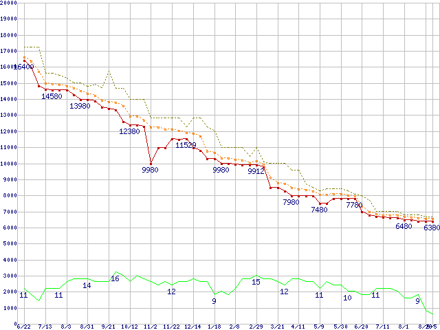 | Athlon X2 4800 (2.5GHz,L2 512KB×2)の価格推移 | | | (2007年6月22日~2008年9月5日) |