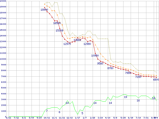 ※このグラフは過去のデータも税率5%相当に調整した税込み相当額のグラフです。 税率変更や、総額表示方式導入(2004年4月)の影響は除いています。 | | | ●凡例 | 最安値 (点線部は販売店未確認 または未調査) | 平均値 | 最高値 | ショップ数 |