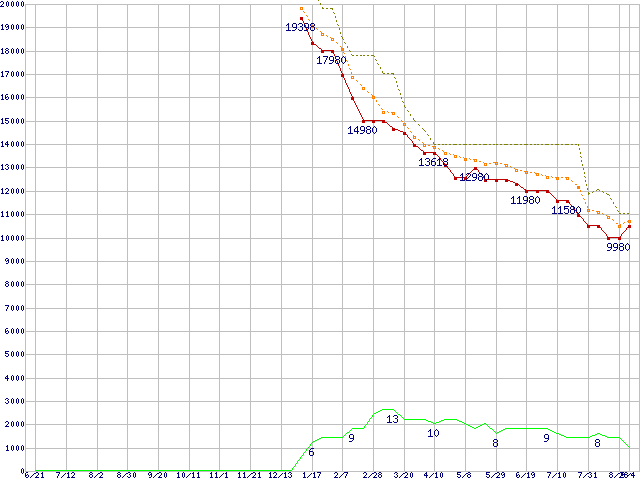 ※このグラフは過去のデータも税率5%相当に調整した税込み相当額のグラフです。 税率変更や、総額表示方式導入(2004年4月)の影響は除いています。 | | | ●凡例 | 最安値 (点線部は販売店未確認 または未調査) | 平均値 | 最高値 | ショップ数 |
