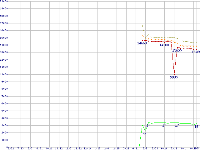 | Core 2 Duo E7200 (2.53GHz,L2 3MB)の価格推移 | | | (2007年6月22日~2008年9月5日) |