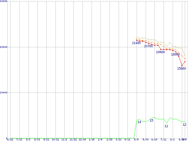 | Phenom X4 9550 (2.2GHz,L2 512KB×4,L3 2MB)の価格推移 | | | (2007年6月22日~2008年9月5日) |