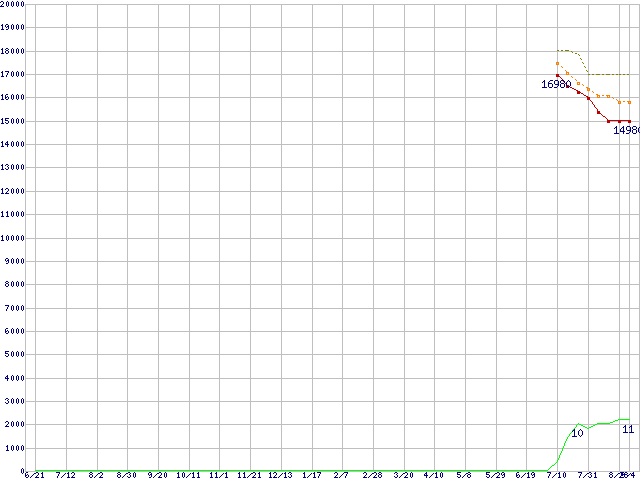 ※このグラフは過去のデータも税率5%相当に調整した税込み相当額のグラフです。 税率変更や、総額表示方式導入(2004年4月)の影響は除いています。 | | | ●凡例 | 最安値 (点線部は販売店未確認 または未調査) | 平均値 | 最高値 | ショップ数 |