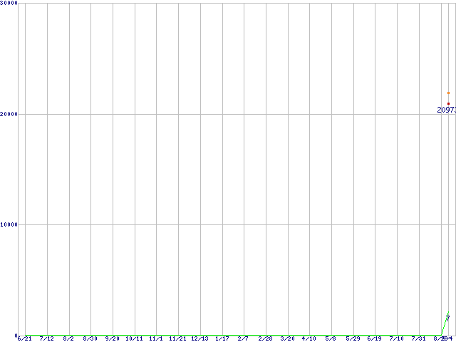 ※このグラフは過去のデータも税率5%相当に調整した税込み相当額のグラフです。 税率変更や、総額表示方式導入(2004年4月)の影響は除いています。 | | | ●凡例 | 最安値 (点線部は販売店未確認 または未調査) | 平均値 | 最高値 | ショップ数 |