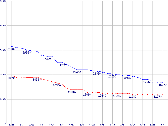 Deskstar P7K500 (7200rpm,3Gb/s)の最安値推移