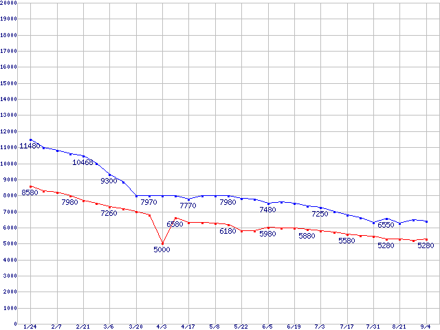 Deskstar P7K500 (7200rpm,3Gb/s)の最安値推移