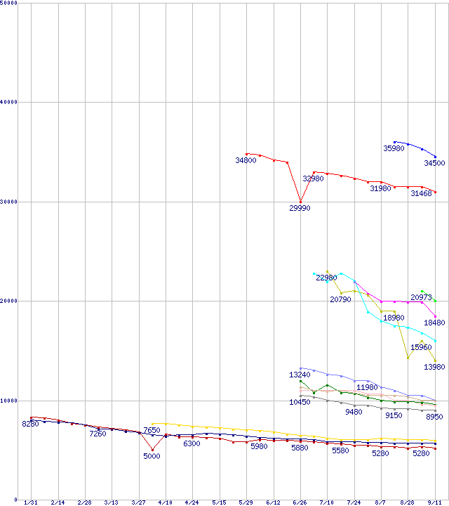 | HDD 300~400GB未満の最安値推移 | | | (2008年1月31日~2008年9月11日) |