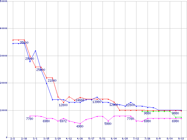 メモリ主要製品(最安値1万円以上)の最安値推移
