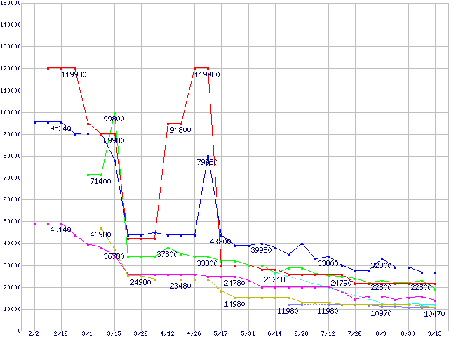 メモリ主要製品(最安値1万円以上)の最安値推移